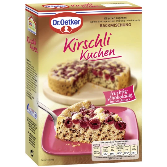 ***Backen*** Dies enthält die Packung: 335 g Backmischung 100 g Schokoladenflocken Sie benötigen: Springform (Ø 26 cm), z. B. Dr. Oetker etwas Fett Und Sie fügen hinzu: 1 Gl. Sauerkirschen (Abtropfgew. 350 g) 175 g weiche Margarine oder Butter 3 Eier (Größe M) 1 Vorbereiten Springformboden fetten. Backofen vorheizen. Ober-/Unterhitze: etwa 170°C Heißluft: etwa 150°C Sauerkirschen auf einem Sieb gut abtropfen lassen. 2 Teig bereiten Backmischung in eine Rührschüssel geben. Margarine oder Butter und Eier hinzufügen, mit einem Mixer (Rührstäbe) auf höchster Stufe 3 Min. zu einem glatten Teig verarbeiten. Dann erst Schokoladenflocken zufügen und kurz unterrühren. Teig in die Form geben und glatt streichen, die Sauerkirschen darauf verteilen, dabei etwa 1 cm am Rand frei lassen. 3 Backen Form auf dem Rost in den Backofen schieben. Einschub:unteres Drittel Backzeit: etwa 60 Min. Springformrand und Kuchen vom Boden lösen, aber mit Springformboden auf einem Kuchenrost erkalten lassen. Vor dem Servieren nach Belieben mit Puderzucker bestreuen.
